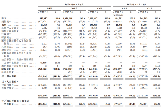 截至2021年3月31日止三个月,公司产生收入7.654亿元,较截至2020年3月31日止三个月的4.648亿元增长64.7%。于2018年、2019年及2020年以及截至2021年3月31日止三个月,公司分别录得年内或期内的除税前亏损2.419亿元、5.96亿元、10.409亿元及15.728亿元。