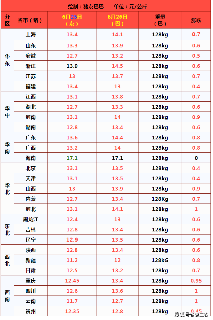 据猪价数据显示,6月26日,国内生猪价格出栏均价13.68元/公斤,猪价暴涨0.67元/公斤,行情即将涨至14元/公斤!而在国内大部地区,猪价也呈现触底反弹的态势,其中,低价区,猪价逐步逃离低洼地带,东北生猪价格也稳定在13~13.5元/公斤!而在华北、西北多地,北方市场,猪价呈现0.4~1元/公斤的涨幅,河北地区,生猪出栏均价涨至14.1元/公斤,行情“破6入7”,涨势表现突出!