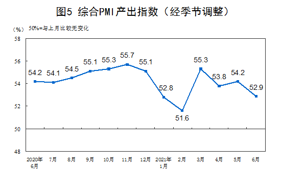 6月份,综合PMI产出指数为52.9%,比上月回落1.3个百分点,表明我国企业生产经营活动总体扩张步伐有所放缓。