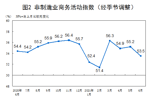 6月份,非制造业商务活动指数为53.5%,较上月回落1.7个百分点,非制造业扩张力度有所减弱。