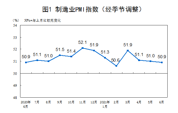 国家统计局6月30日发布的数据显示,6月份,中国制造业采购经理指数(PMI)为50.9%,较上月微落0.1个百分点,继续位于临界点以上,制造业延续稳定扩张态势。