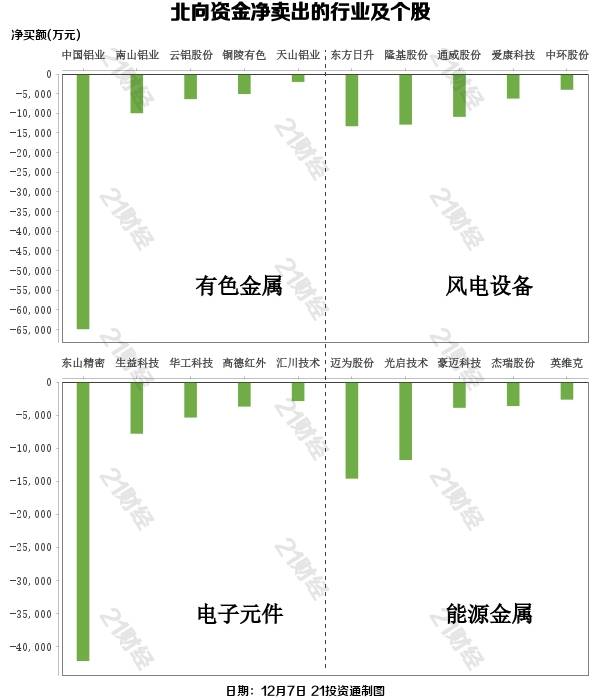 北向资金减持了32个行业,其中有色金属最多,净卖出金额达6.91亿元,其次是风电设备行业,净卖出3.54亿元。