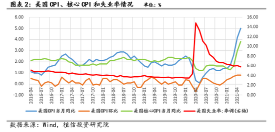 美联储货币政策大幅收紧概率较小。大宗商品价格自一季度开始大幅上涨,给美国带来了较大通胀压力,试试纷纷猜测美联储加息缩表在即。但当前美国经济运行依然存在一系列不确定性和风险,美联储于2021年内选择收紧货币政策会较为谨慎,主要原因在于:一是美联储主流意见认为表态通胀压力是暂时的;二是失业率居高不下,年初以来一直在6%徘徊,远高于疫情前水平;三是美联储警惕taper的“削减恐慌”效应,不会仓促宣布实行taper。