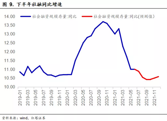 下半年社融同比小幅回升,一来是因为我们预计政府债券会在下半年加速发行,同时会延续到四季度;二来去年永煤事件后,企业债融资大幅缩水,形成低基数;三来去年表外三项在四季度的时候压降力度较强,今年在我们的判断中,压降规模会平均分摊到三四季度。