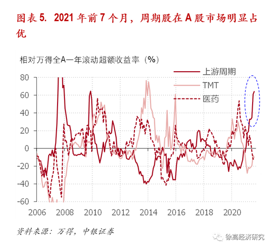 对各类资产而言,当前内循环过度冷却的状况有利于债券市场。不过随着国内宏观政策的转向,债市未来可能会因为经济前景的改善而承压。在政策转向较为确定,但转向后政策力度尚待观察的背景下,A股市场整体估计会处在震荡状态,缺乏系统性机会。在结构性机会中,低估值周期股仍然是配置方向。一方面,供给约束下重估中国产能的逻辑仍然成立(参见《全球再循环的资产价格含义》);另一方面,政策转向也会给周期股带来更好预期。此外,今年下半年美联储宽松政策的退出估计会给全球高估值股票带来下行压力。此时低估值周期股的安全性更高。(图表 5)