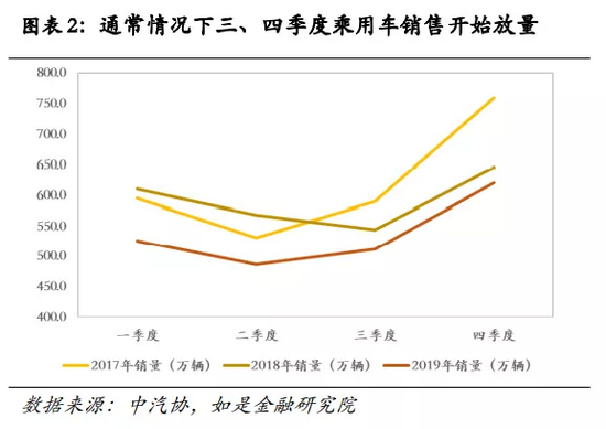 根据汽车销量以往的季节性波动经验,通常情况下第三季度汽车销售开始放量,四季度通常为一年销售高峰。由于2020年新冠疫情爆发,全年分月份季节性销售波动失真。因此我们选择观察疫情爆发前三年,即2017到2019年的消费季度波动来进行观察。以2019年为例,根据中汽协数据,一至四季度我国全部乘用车销售量分别为526.0万辆、486.4万辆、511.2万辆、619.8万辆,具体体现为三季度秋季车展期间开始放量,年底经销商销售冲击业绩叠加消费者购车过年需求,四季度通常表现为一年销售高峰。