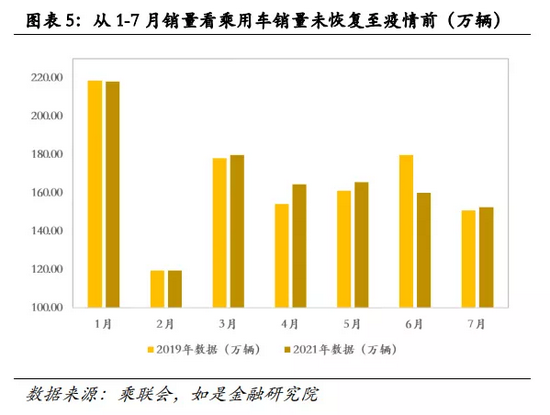 在疫情期间积压的消费需求基本释放殆尽,汽车销售并没有恢复到疫情前水平,市场规模顶部难以冲破。根据乘联会公布的数据,今年1-7月乘用车销量共计约1159万辆,和去年同期相比增长22.4%。去年疫情爆发,居民外出消费行为受阻,叠加预防性储蓄倾向严重,汽车销量在去年一季度一度跌入谷底,因此今年的销量数据受到基数效应影响看似乐观。但实际上今年起乘用车销量的月度波动基本已经恢复正常规律,2021年1-7月销量分别为218.0万辆、119.4万辆、179.6万辆、164.3万辆、165.5万辆、159.9万辆、152.3万辆,和疫情爆发前的2019年相比较可判断现阶段疫情期间被推迟的消费需求基本在2020年释放殆尽,汽车销售并没有恢复到疫情之前的2019年1-7月1161.38万辆的销售数据。