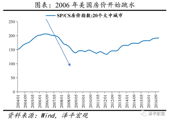 2003年美国经济开始复苏,出于对通货膨胀的担忧,美联储从2004年6月起两年内连续17次调高联邦基金利率,将其从1%上调至2006年的5.25%。由于次贷大多为浮动利率贷款,重新设定的贷款利率随基准利率上升而上升,大多数次贷借款人的还款压力大幅增加。基准利率的上升逐渐刺破了美国房地产市场泡沫,进入2006年后,反映美国主要城市房价变动的S&P Case-Shiller 指数开始明显下跌。对于抵押贷款供应商来说,房价下跌降低了抵押品价值,导致其无法通过出售抵押品回收贷款本息。对于次贷借款人来说,房价下跌使其不能再通过房屋净值贷款获得新的抵押贷款,而即便是出售房产也偿还不了本息,所以只得违约。