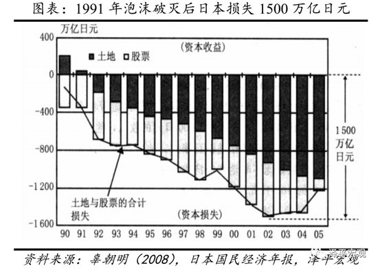 辜朝明在其著作《大衰退》中提到,地产和股票价格的下跌给日本带来的财富损失,达到1500万亿日元,相当于日本全国个人金融资产的总和,这个数字还相当于日本3年的GDP总和。从下图可知,房地产比重无疑大于股票。