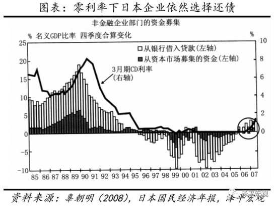 房地产和土地是很多企业重要资产和抵押品,随着这些资产价格的暴跌,日本企业资产负债表出现明显恶化。企业为修复其恶化的资产负债表,不得不努力归还债务,1991年后尽管利率大幅下降,日本企业从外部募集资金却持续减少,到90年代中,日本企业从债券市场和银行净融入资金均转为负值。