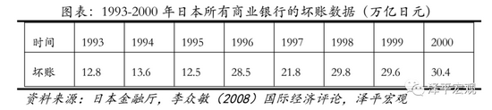 房地产价格大幅下跌和经济低迷使日本银行坏账大幅上升。1992年至2003年间,日本先后有180家金融机构宣布破产倒闭[参见吉野直行(2009),国际经济评论]。日本所有银行坏账数据,从1993年的12.8万亿日元上升至2000年的30.4万亿日元[参见李众敏(2008)国际经济评论]。