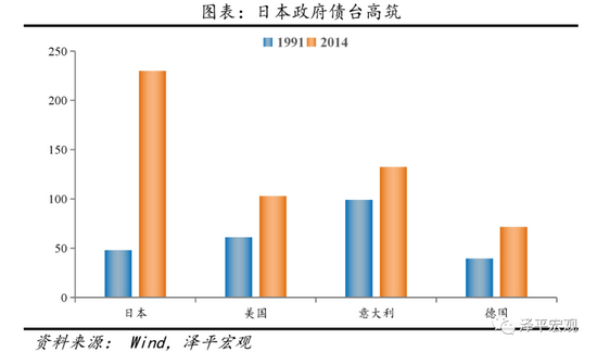 经济的持续衰退,和政府的逆周期调控,使得日本政府债台高筑。1991年日本政府债务/GDP比重为48%,低于美国的61%,意大利的99%,略高于德国的39.5%,2014年,日本政府债务/GDP比重为230%,远高于美国(103%),德国(71.6%),意大利(132.5%)等。
