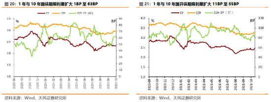 本周长债收益率上升。全周来看,10年期国债收益率上行1BP至2.97%,10年国开债收益率上行3BP至3.23%。1年与10年国债期限利差扩大1BP至63BP,1年与10年国开债期限利差扩大11BP至85BP。