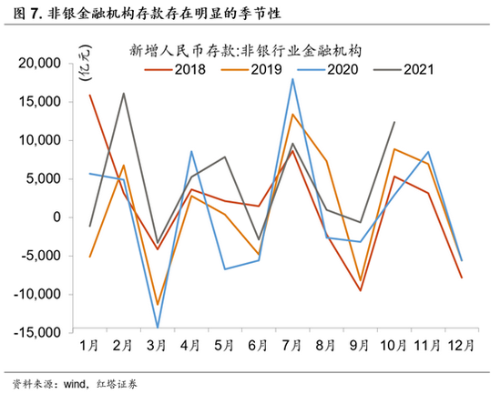 非银存款同比大幅增加可能与理财相关。一般在季末的时候,理财季末到期冲存款,然后次月续作,这会使得非银存款出现一个明显的季节性波动。而2020年10月的时候,这一效应并不明显,从而使得当时基数偏低,导致10月同比大幅走高。另外,近期理财规模也在稳步增长,这也会对此形成支撑。