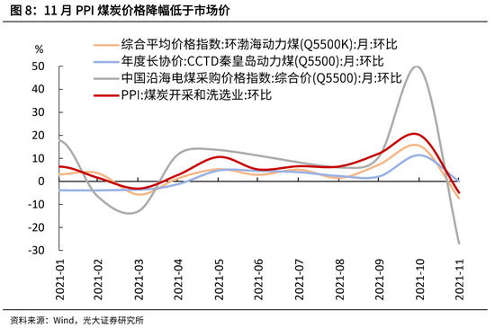 一是,PPI统计的煤炭价格降幅低于市场的现货价降幅,与11月煤炭长协价保持稳定、企业的存货调整周期有关。从供需角度来看,预计未来煤炭长协价将有所回落,加之企业逐步消耗前期存货,煤炭将成为未来几个月内PPI的拖累项。