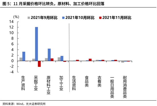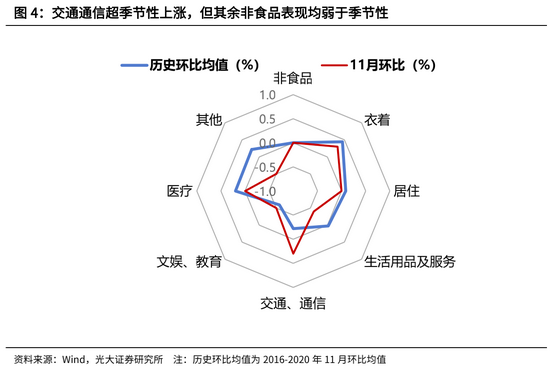 一方面,受汽油、柴油、液化石油气价格涨幅放缓影响,11月交通工具用燃料环比涨幅自上月的4.7%回落至3.0%,水电燃料环比涨幅自上月的2.0%回落至0.2%;另一方面,部分工业消费品价格涨幅回落。如,交通工具价格环比涨幅连续两个月收敛,自9月的0.5%回落至本月的0.2%;生活用品价格环比回落至-0.4%,上月为0.3%,低于过去五年同期均值0%。