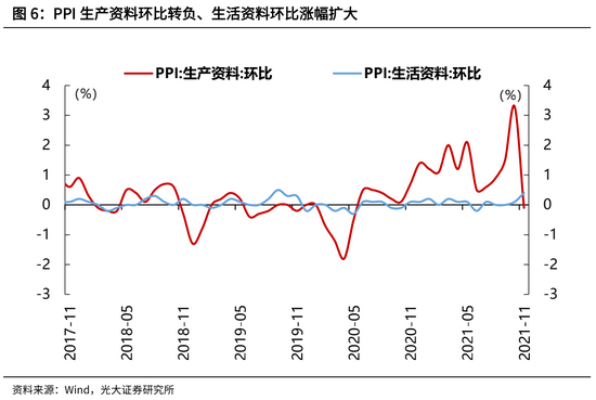 二是,PPI生活资料环比涨幅扩大,受前期原材料上涨影响,食品、衣着、一般日用品开始提价。PPI生活资料环比自上月的0.1%扩大至0.4%,高于同期生产资料的环比-0.1%。其中,食品价格环比自上月的0.2%扩大至0.8%,衣着、一般日用品价格环比自上月的0.3%小幅升至0.4%。