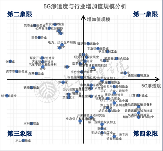 处在第二象限(5G渗透率低、对总体经济影响度高)的行业是5G产业导入的重点方向,应鼓励技术和模式创新,增加5G的渗透率和影响力;