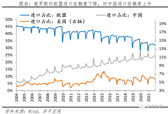 从进口结构看,分国别来看,截至2021年,中国占俄罗斯进口金额的25%,是俄罗斯最大的进口国,欧盟与美国合计占俄罗斯进口的38%,较2014年下降10%。分商品来看,机械和工具占俄罗斯进口金额的71.15%,排名第二的药品仅占4.72%,随后是汽车与服装等工业品,俄罗斯从欧美的进口主要集中在机电产品、汽车零部件、医药等产品,切断SWIFT系统将主要影响其对欧美的进口。