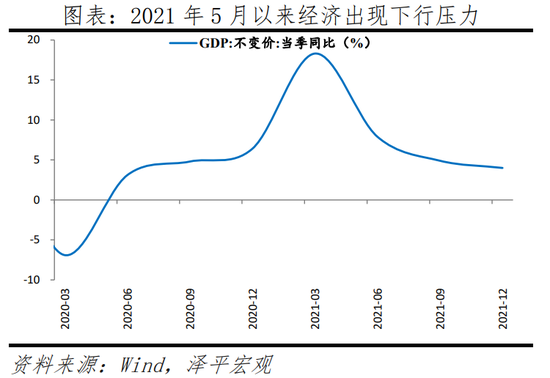自2021年下半年以来,经济出现下行压力,货币政策逐步转向宽松。GDP增速三季度4.9%,四季度5%,逐季回落。从三驾马车看,房地产投资持续下滑、基建投资持续低迷、制造业投资仍有韧劲但呈放缓;消费增长疲软;出口仍强但新订单放缓。上游大宗商品涨价,挤压中小企业生存空间。