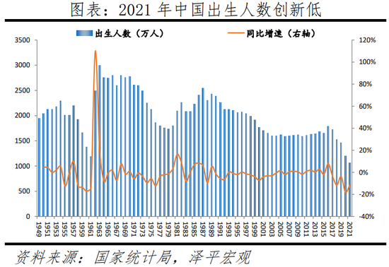 人口因素变化缓慢但势大力沉,中国少子老龄化问题已日趋严峻。2021年出生人口1062万,比2020年下降138万,人口出生率为60年来新低。中国总和生育率从1970年代之前的6左右,降至1990年的2左右,再降至2010年后的1.5左右,再降到2020年的1.3。根据趋势估计中国人口将在“十四五”时期进入负增长。从长期趋势看,随着生育堆积效应逐渐消失、育龄妇女规模持续下滑、新一代年轻人观念改变、抚养成本上升等,出生人口仍将处于快速下滑期。