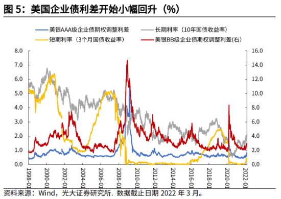 现阶段,市场对美国经济衰退风险的交易,导致美债收益率曲线日渐平坦。截至3月15日,10年/2年美债收益率利差已缩窄至30BP,显示市场预期美联储加速货币政策收紧将提振短端利率,而经济前景疲软拖累长端利率上行幅度。