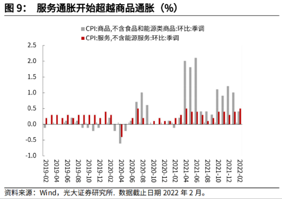从2月CPI分项数据可以看出,核心商品通胀增速有所缓和,但是,核心服务消费,比如租房价格和运输服务将持续支撑通胀,显示居民从商品消费到服务消费的切换。考虑到服务消费在CPI中的比重大于商品价格,对通胀形成上行压力。