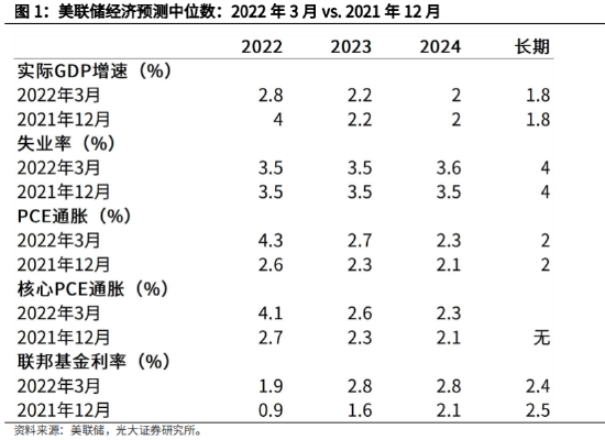 4)3月FOMC对2022年GDP增速预测中值下调至2.8%(12月为4%),2023年GDP预测中值持平在2.2%,2024年GDP预测中值持平在2%;2022年PCE通胀预测中值上调至4.3%(12月为2.6%),2023年上调至2.7%(12月为2.3%)。