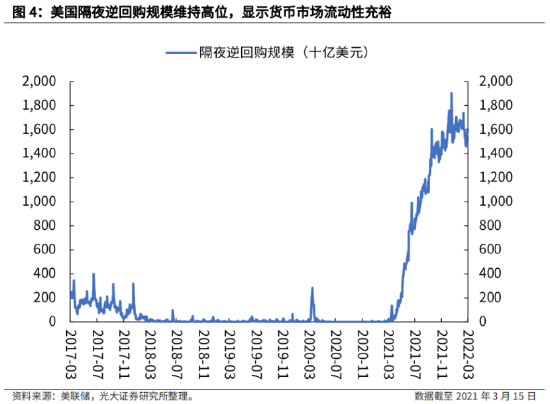 可以看到,美联储隔夜逆回购规模已从疫情前(2020年2月)接近0的水平一路上升至2022年3月上旬的1.6万亿美元,显示货币市场流动性非常充足。