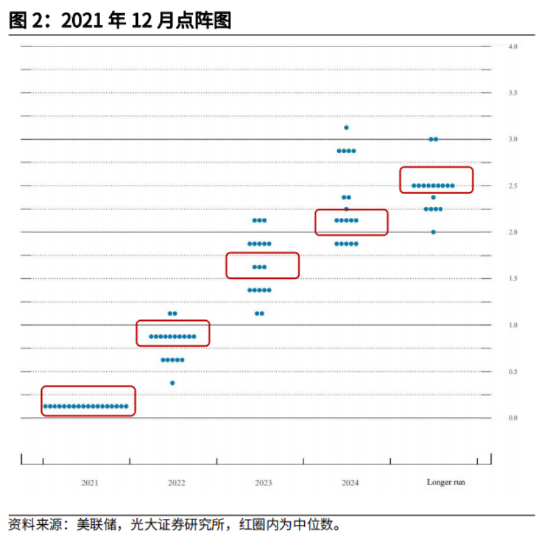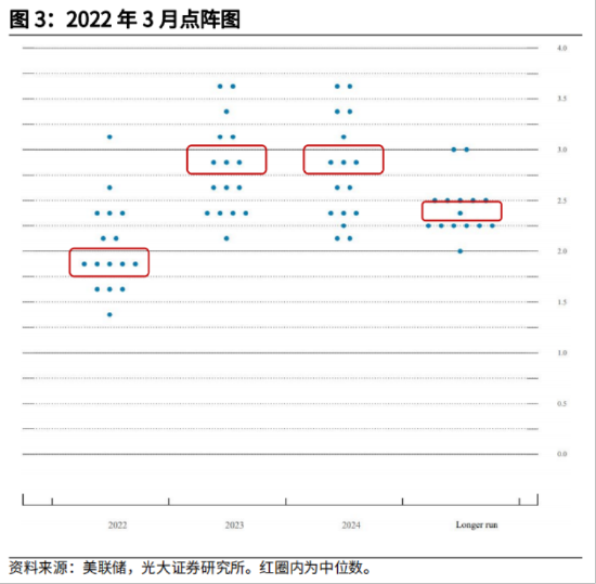 3)点阵图显示,2022年联邦基金利率预测中值上调为1.9%(12月为0.9%),2023年预测中值为2.8%(12月为1.6%),2024年预测中值为2.8%(12月为2.1%),长期利率保持在2.4%;