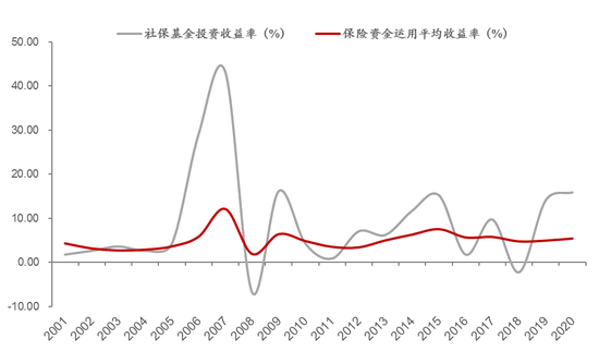 2001-2020年社保基金投资收益率与保险资金运用平均收益率对比
