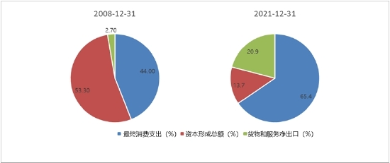 从中国三大需求对GDP增长的贡献率来看,2008年,最终消费的GDP增长贡献率为44%,而资本形成总额的GDP贡献率为53.3%;到2021年,最终消费的GDP增长贡献率已经升至65.4%,而资本形成总额对GDP增长贡献率降至20.9%,中国经济已经悄然进入了以消费为主要需求动力的时代。