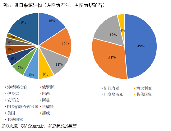 居安思危:多元化供应渠道。在国际关系愈发复杂的宏观背景下,供应链安全的重要性也逐渐显现,2021年中共中央政治局会议审议了《国家安全战略》,指出“确保粮食安全、能源矿产安全、重要基础设施安全,加强海外利益安全保护”。通过对中国进出口货物种类进行分析,发现能源(例如,石油、天然气)与金属原材料(例如,铜、锰矿石等原材料)均较为依赖进口输入,其中石油进口依赖度为73%,天然气为103%[1],铜为93%,锰矿石为96%。从能源消费来看,石油被誉为“工业的血液”,随着工业制造业蓬勃发展,石油及其制成品对于现代化工业生产的重要性不言而喻,不仅如此石油制成品也涉及农林牧渔、交通运输、批发零售、生活消费等方方面面,中国石油消费量也由2007年的32亿吨,上升至2021年的71亿吨,增幅超过100%。天然气作为清洁燃料,随着绿色低碳概念不断推进,天然气未来消费占比仍有上升空间。从能源供给来看,一方面,中国石油、天然气已探明的存储量全球排名均不高,难以自给自足,故而依赖进口的情况仍将持续。然而,中国海洋油气与非常规天然气储量较为丰富,或将是未来勘探、开采的重要方向,通过推动配套技术、合理利用自有能源资源,将在一定程度上缓解对于能源进口的依赖性,进而提升能源安全性。另一方面,中国能源进口主要依赖中东、俄罗斯、美国等国家地区,总占比超过一半以上。尽管能源进口来源地数量较多,根据UN Comtrade数据,中国与52个国家地区均有石油进口联系,但结构比例仍可以继续向多元化方向演进,尤其是当前中东、俄罗斯等石油产地地缘风险上升,或将对能源安全进口造成负面冲击。从金属原材料来看,以铝为例,今年一季度进口同比增长超过20%,进口依赖度上升至约60%,主要进口依赖新几内亚、澳大利亚、印度尼西亚三国,占比超过96%,进口渠道尤为集中,供应链脆弱性也随之显现。