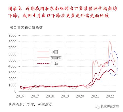 在4月主要的经济数据中,工业生产(工业增加值)和消费(社会消费品零售总额)的走低应该主要缘于疫情影响。疫情带来的供给冲击之影响在3月工业增加值数据中就已显现,并在4月数据中进一步显化。餐饮消费断崖式滑坡也凸显了疫情对消费的影响。不过,4月我国出口金额的走低倒应该主要是外需走弱所致。一个证据是,在最近的两个月,我国出口集装箱运价指数跟随出口金额走低而下滑。但同期,疫情冲击程度小于我国的东南亚国家,其出口集装箱运价指数也明显下降。(图表 3)