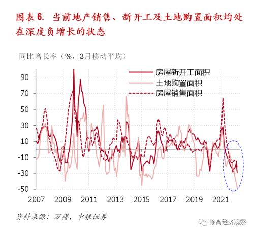 面对地产行业的弱势,从今年4月以来,各地的地方政府已纷纷开始放松地产政策,通过降低首付比例、提供购房补贴、取消限售等政策来提振地产销售。2022年5月15日,人民银行和银保监会还联合发通知下调房贷利率【2】。过去,这些刺激地产需求的政策往往能明显提振地产销售,带动地产投资回暖,进而让地产行业走出低谷。但当下地产行业的情况与过去大不一样。在持续的融资挤压中,开发商拿地建房的意愿已经大大降低,令地产供给大为收紧。从2021年2季度开始,房屋新开工面积和土地购置面积就进入负增长状况。在最近3个月,房屋新开工面积同比负增长29%,土地购置面积同比负增长48%,均创出了近15年的最低增速。在地产供给瓶颈收得如此之紧时,刺激地产需求很可能让房价大幅反弹。(图表 6)