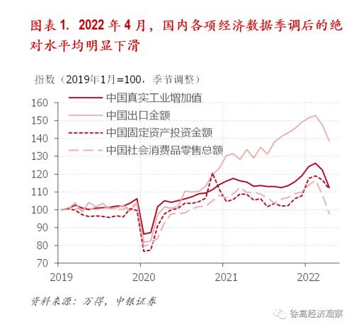 受疫情冲击,2022年4月我国宏观经济数据全面下滑。季节调整之后,4月我国工业增加值、社会消费品零售总额、固定资产投资金额和出口的绝对水平均显著下滑。注意,这代表着经济活动绝对规模的收缩,而不仅仅是增速的放缓。由于疫情的影响在3月经济数据中就已浮现,4月数据走弱不算意外。