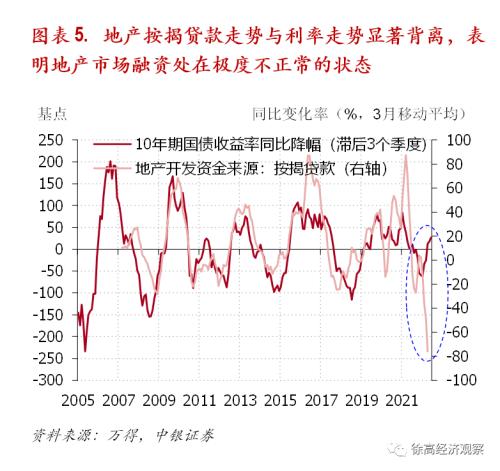 比融资下滑更让人担心的是,目前地产行业的融资处在极为反常的状态。从历史经验来看,地产行业融资对利率高度敏感。在过去十几年,地产按揭贷款的同比增速与10年期国债收益的同比降幅之间高度正相关——利率下降通常伴随着按揭贷款增长的加速。但在今年前4个月,10年期国债收益率低于去年同期,且同比降幅还逐步走扩,但同期按揭贷款同比增速却在负值区间越陷越深,并在今年2月、3月和4月连创新低。按揭贷款增速与国债收益率降幅之间的相关性已被打破,二者当下的背离程度前所未见。(图表 5)