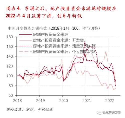 在2022年4月20日发表的《警惕经济的二次探底风险》一文中,笔者曾说:“地产行业的预期已经转为悲观,悲观预期自我实现的恶性循环已经形成。在这循环中,地产开发商信用风险的上升与外界对地产行业信心的下降相互加强。”目前,地产行业的恶性循环仍未被打破,且情况又因疫情而进一步恶化。季节调整之后,地产投资资金来源的绝对规模在4月显著下滑,创下近5年的新低。(图表 4)