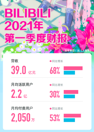 北京时间5月13日(美东时间5月13日),哔哩哔哩(NASDAQ: BILI,HKEX:9626)公布了截至2021年3月31日的第一季度未经审计的财务报告。财报显示,B站一季度营收达39.0亿元人民币,同比增长68%,再度超出市场预期。与此同时,毛利率从去年同期的23%增长至本季度的24%。值得一提的是,一季度B站付费用户同比增53%,正式突破2000万大关,多元化营收再创新高。