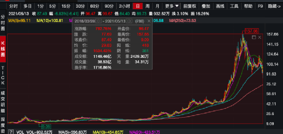 2018年3月,B站以每股美国存托股票(ADS)11.50美元的价格在美国纳斯达克正式上市,整体募资规模4.83亿美元。2020年,B站美股股价一路高歌猛进,累计暴涨360.37%。2021年2月B站美股股价再创历史新高至157.66美元/股。截至5月13日,上市三年来,B站美股股价已经飙涨了792.76%。