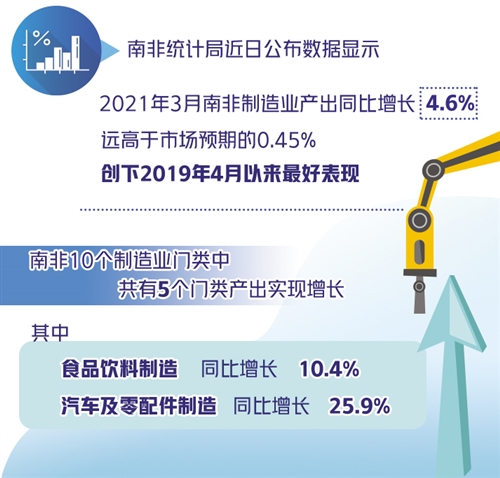 南非统计局近日公布的数据显示,2021年3月份南非制造业产出同比增长4.6%,远高于市场预期0.45%的增速,创下2019年4月份以来最好表现,表明南非制造业生产加速复苏。