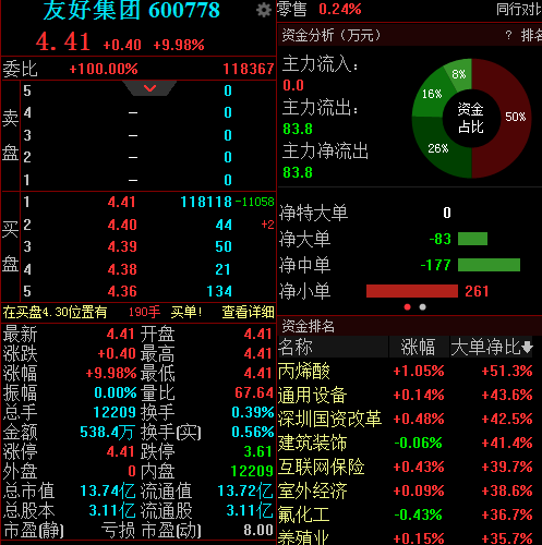 7月1日,友好集团开盘一字涨停,截至发稿,股价报4.41元,涨停板上封单超11万手。