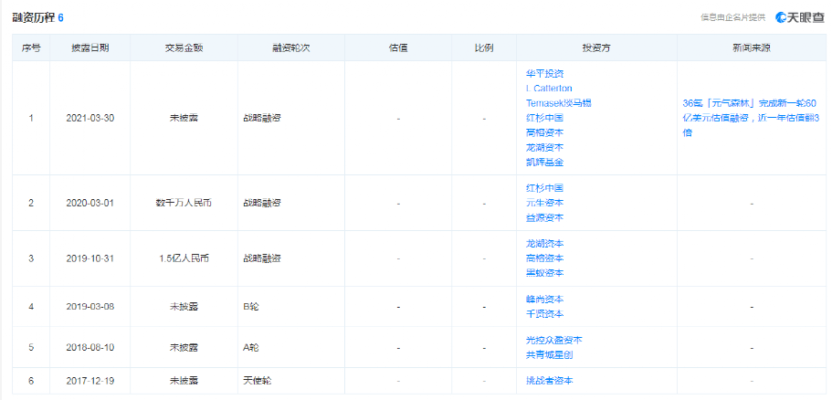 天眼查数据显示,截至目前,元气森林已完成六轮融资,并获得红杉中国、龙湖资本、高榕资本、华平投资等多家投资。今年3月,在完成新一轮融资后,元气森林估值达60亿美元。