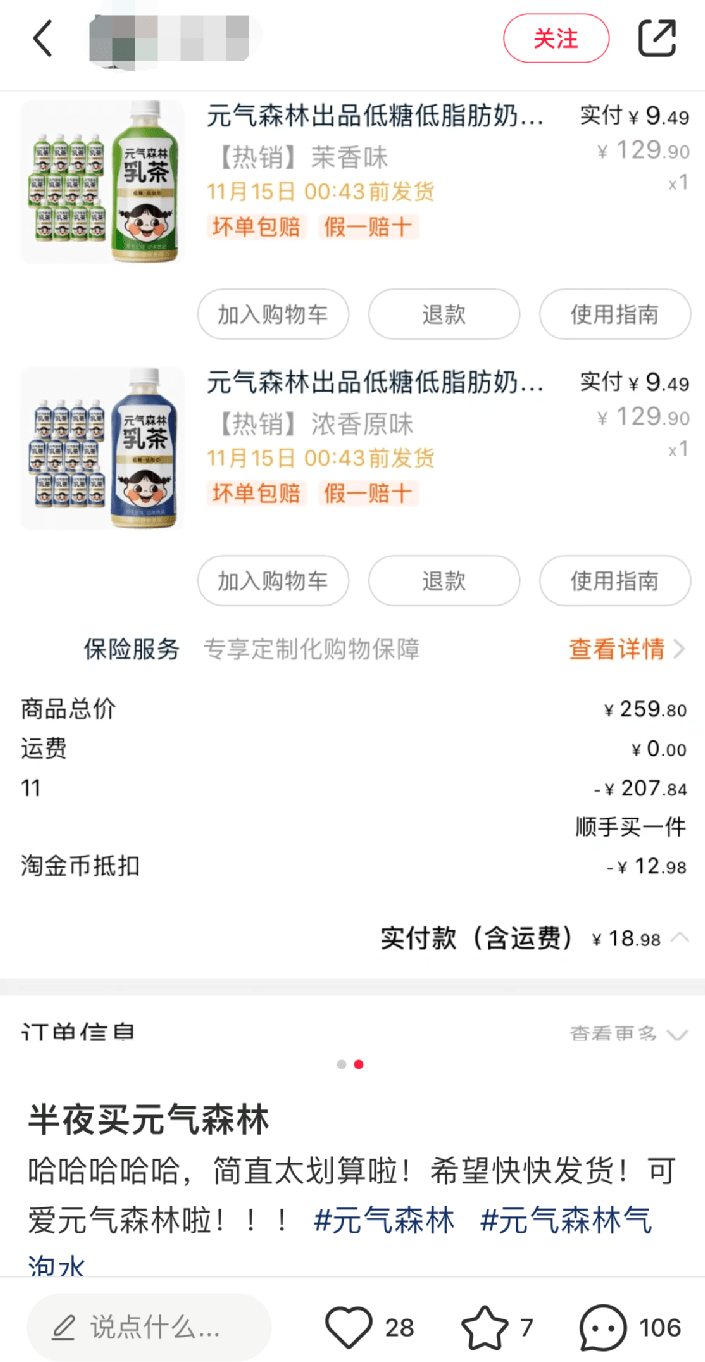 有的消费者购买总价259.8元的元气森林乳茶产品,最后实付18.98元,表示“简直太划算了”。
