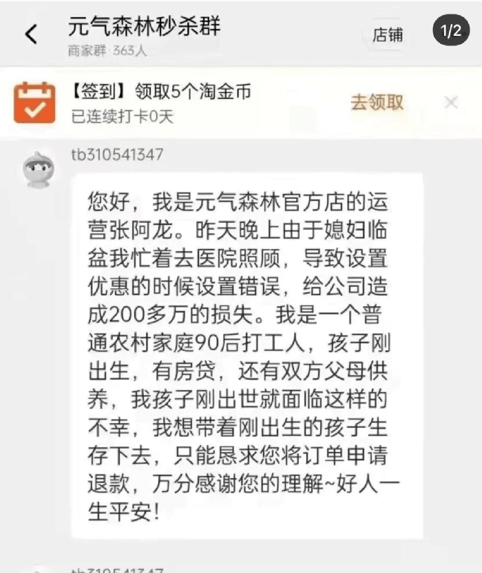 但不久后,自称元气森林官方运营人员便私信消费者,表示出现如此大的打折力度,是因为个人设置错了优惠,目前已给公司造成了200多万元的损失,由于自己是一个普通农村家庭90后打工人,孩子刚出生、有房贷、需要供养双方父母,为了带着刚出生的孩子生存下去,恳请消费者申请退款。
