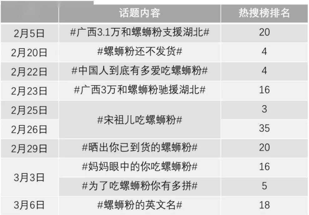 疫情激发了速食需求,螺蛳粉一度被卖到脱销,更是引发连锁反应,一些从来没吃过螺蛳粉的消费者也想跟风尝鲜。最缺货的一个月里,螺蛳粉登上热搜10次,相当于每隔3天就要上一次热搜。