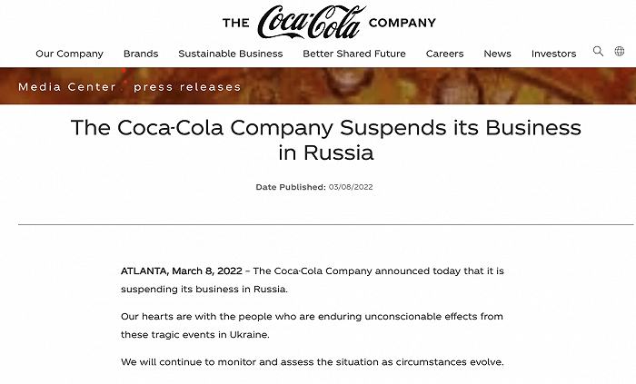 当地时间3月8日,可口可乐公司官网发布声明称,将暂停在俄罗斯的业务。可口可乐公司在声明中称:“我们的心与那些因乌克兰悲剧事件而遭受不合理影响的人们同在。”