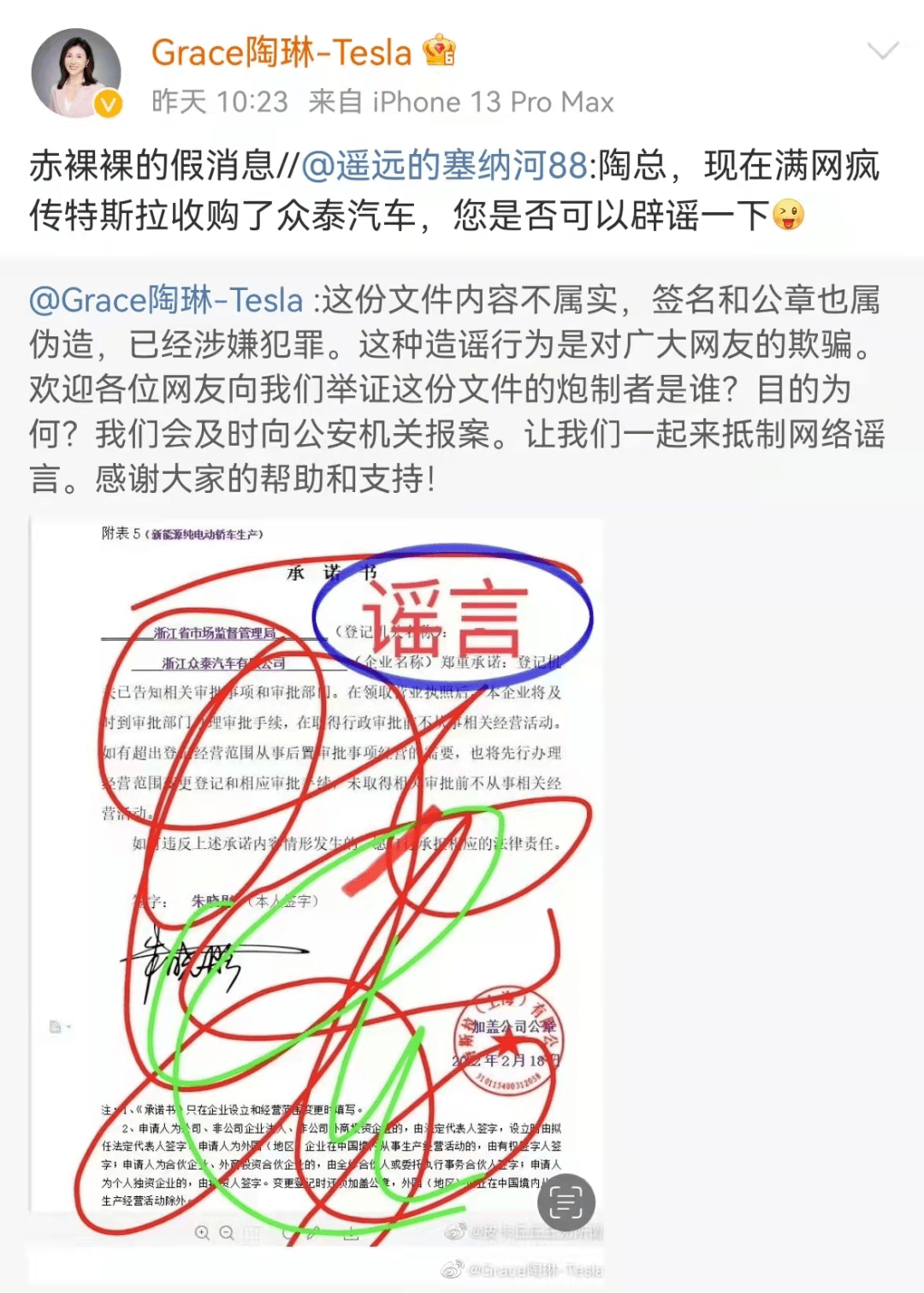 3月13日,面对网友关于“特斯拉收购众泰”的提问,陶琳在微博上斥道,这是“赤裸裸的假消息”。