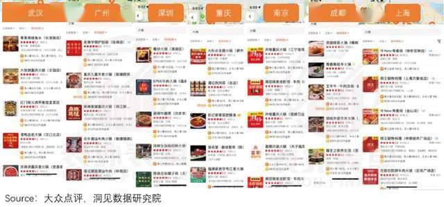 如下图,随机抽取一二线城市的火锅类好评榜单前十名,均不见。上榜的都是单品类或者主题火锅等网红品类。