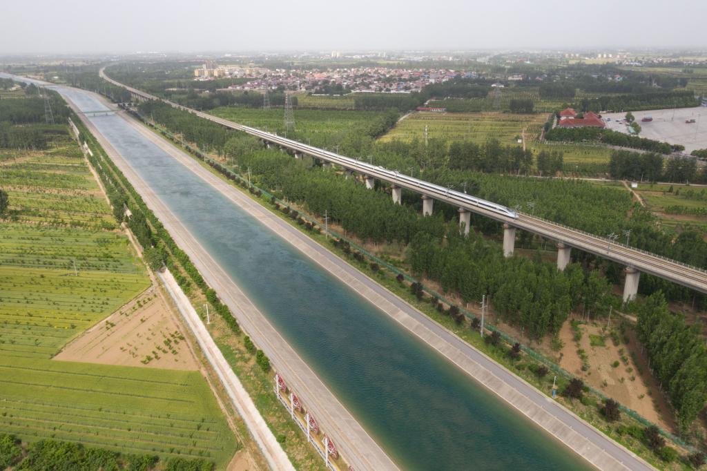 穿过滹沱河,南水北调中线干渠与京广高速铁路不期而遇,在辽阔的平原上画出两条雄伟的纵贯线。